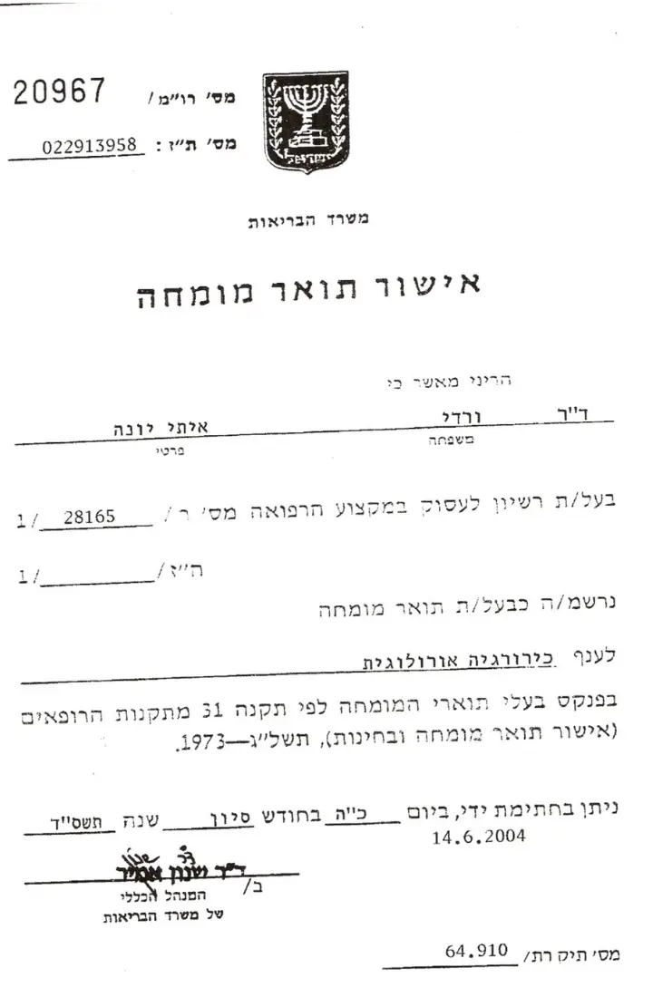 - התמחות (כירורגיה אורולוגית) - המחלקה לכירורגיה אורולוגית בית הספר לרפואה של אוניברסיטת תל אביב המרכז הרפואי ספיר כפר סבא, ישראל.